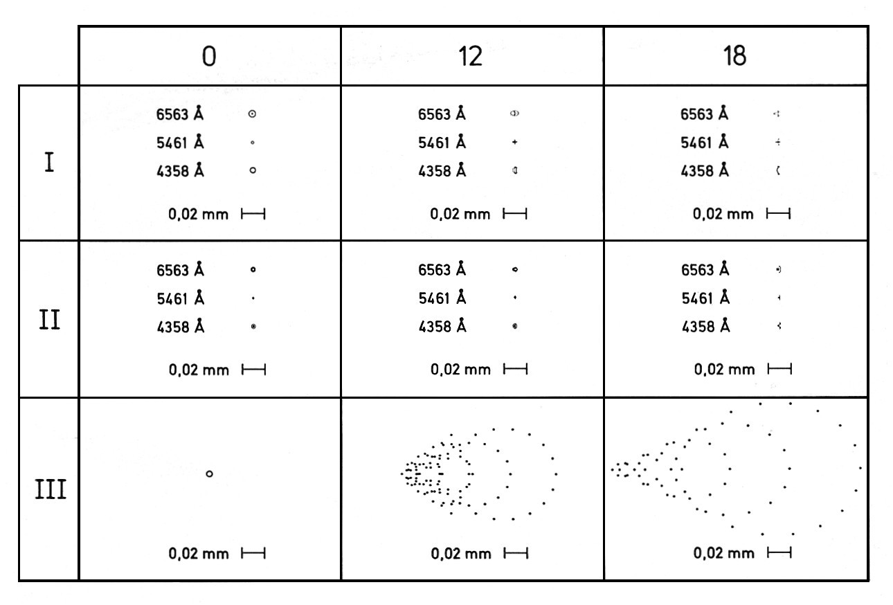| Da das Newton Teleskop ein reines Spiegelsystem ist, sind die Spotdiagramme wellenlängenunabhängig. Die Flatfieldkamera hat jedoch eine Korrektionsplatte aus Glas, deshalb sind die Spotdiagramme wellenlängenabhängig und sind hier für rotes, grünes und blaues Licht angegeben. | |
