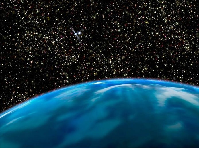 zeicht einen blauen Planeten mit Atmo, der um die gelbe Sonne von Tau Ceti
