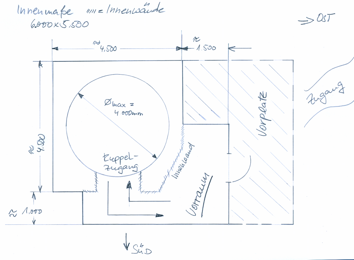 mit Zugang und Himmelsrichtungen. Wichtig: Kuppelzugang