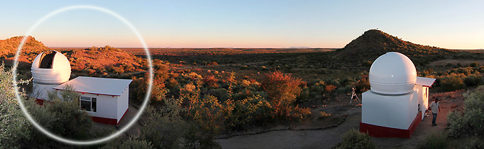 und die Kuppeldrehung. Danach wurde die Teleskopsäule auf dem Instrumentenpfeiler aufgestellt, mit feinstem Quarzsand zur Schwingungsreduzierung gefüllt und mit Schwerlastdübel befestigt. Es folgte der Aufbau der Montierung und der kompletten Teleskopkombination von Franz, Claus und mir. Erste Testbeobachtungen wurden am 2.5. durchgeführt. Die komplette Anlage wurde offiziell am 4.5.2013 in Anwesenheit der Lodgebesitzer eröffnet |