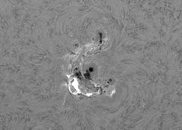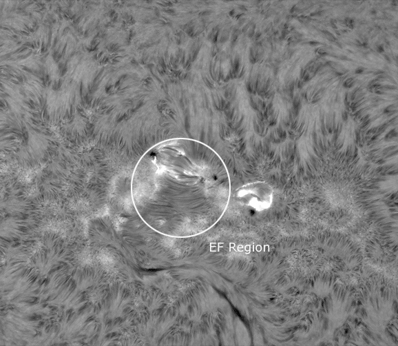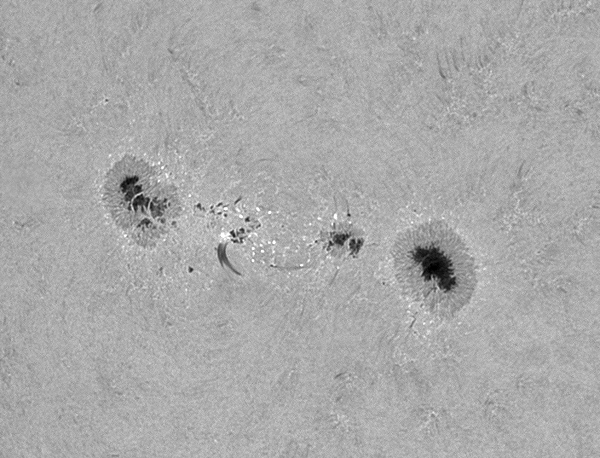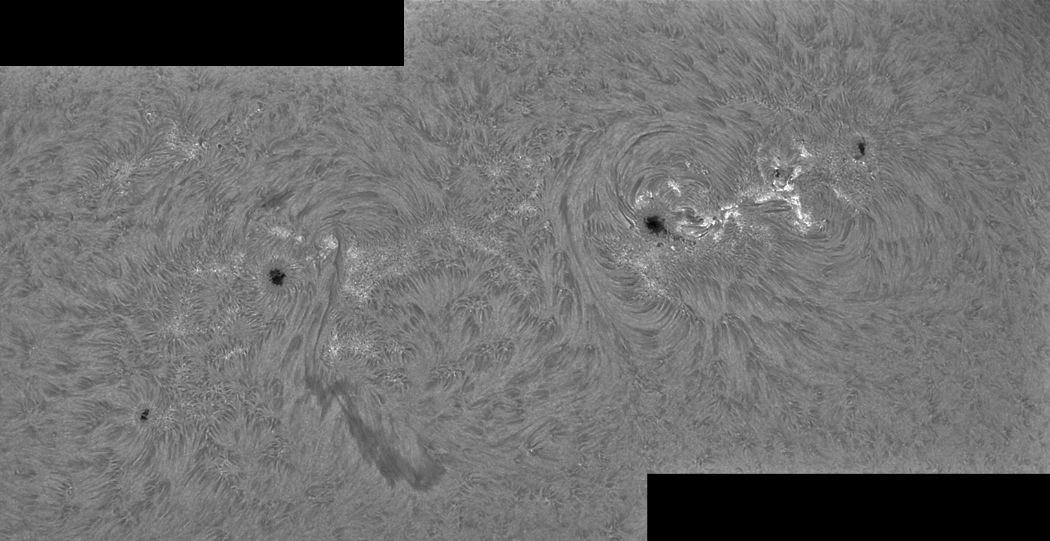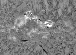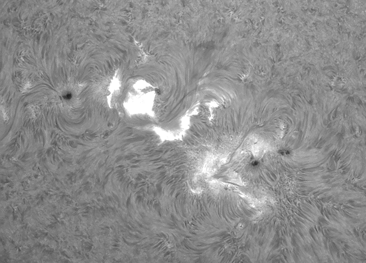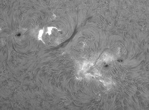 zwischen zwei aktiven Protuberanzen (vermutlich bipolare Fleckengruppe mit