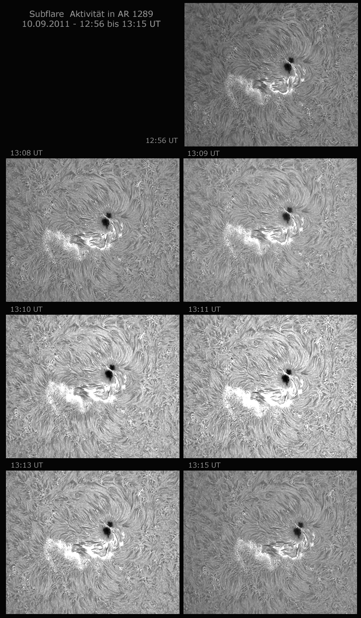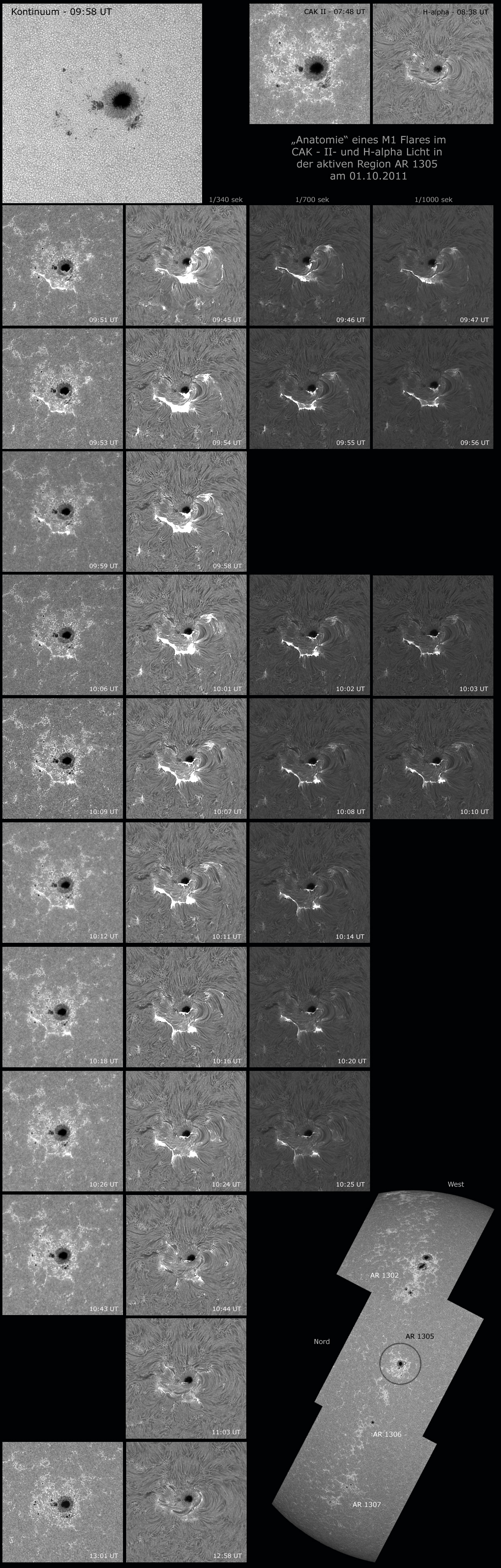 am 1 Oktober 2011 (H-alpha und CaK-II). rechts: Zeitreihe eines Subflares am
