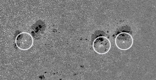 und mitte: Flares im Kalziumlicht in komplexen Sonnenfleckengruppen. Rechts