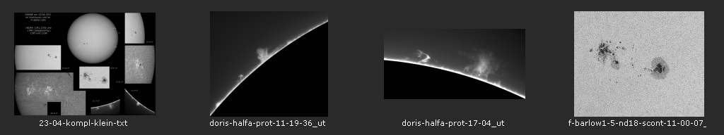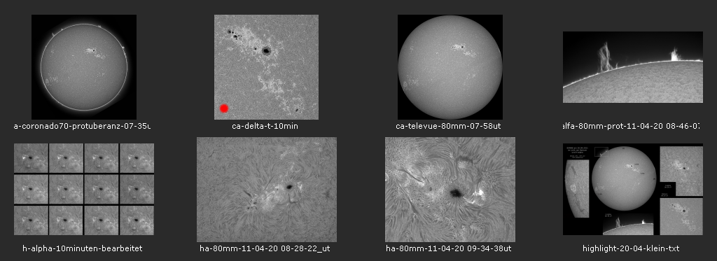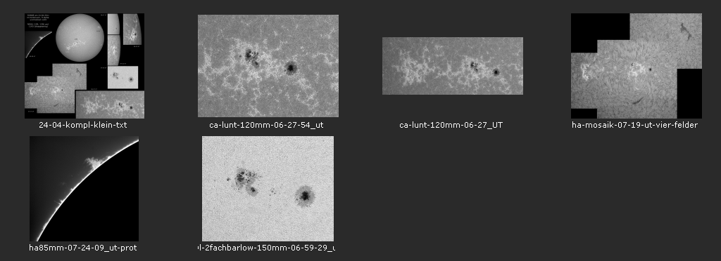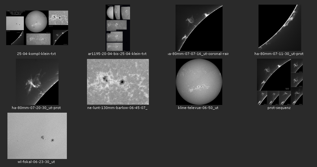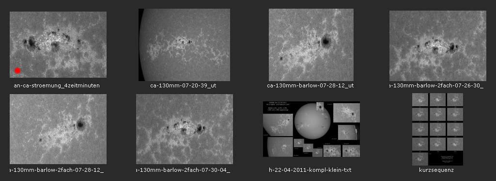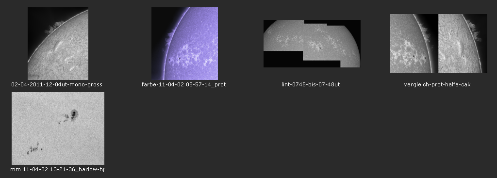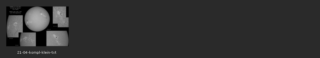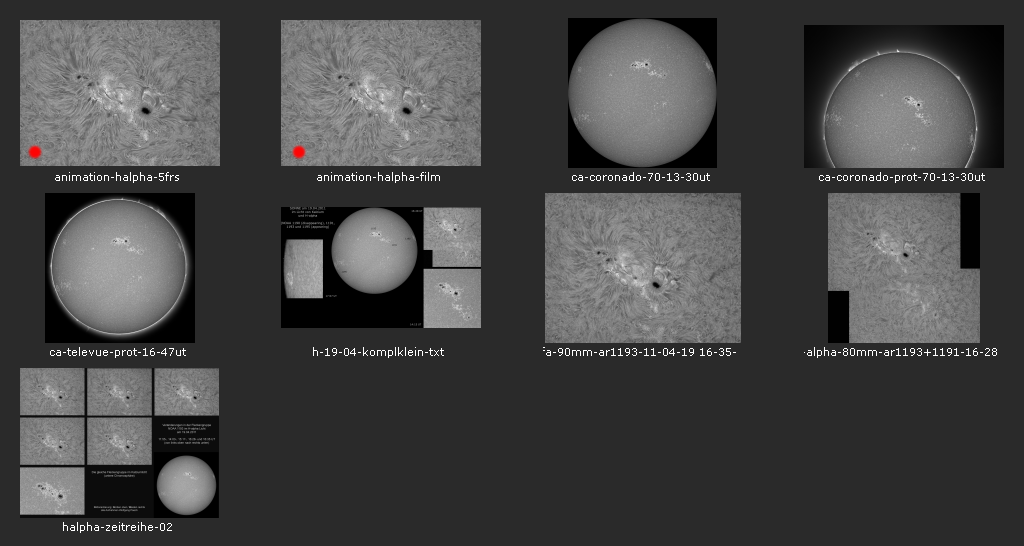 ALLE Vorschaubilder lassen sich durch Anklicken als großes Bild laden, welches jeweils in einem separaten Browserfenster geöffnet wird. Aufnahmekameras waren eine DMK31, DMK 41 und eine Celestron Skyris 445. Die .avifiles bestehen aus jeweils 2000 Rohbildern, von denen 10% gestackt wurden. Animierte Bewegungsabläufe (Zeitraffer) sind in den Vorschaubildern mit einem roten Punkt markiert. |