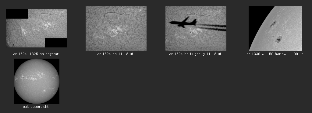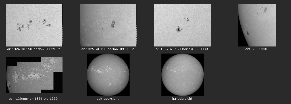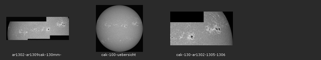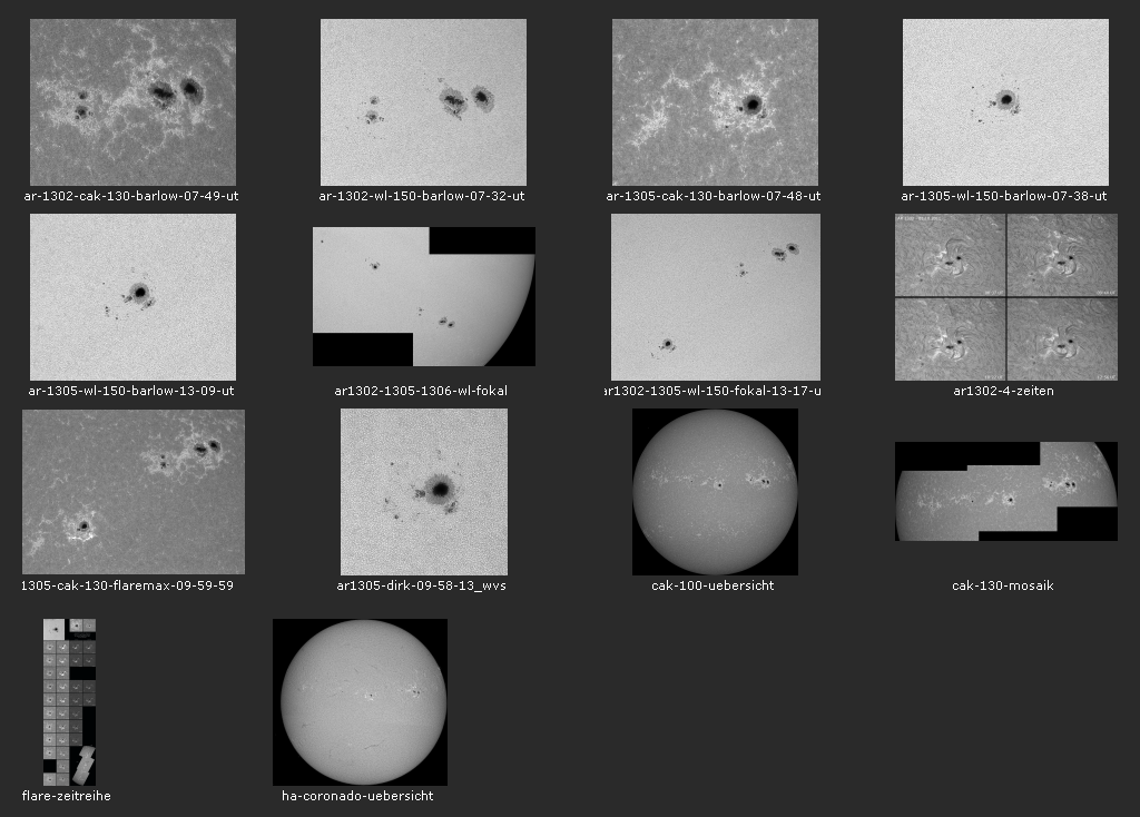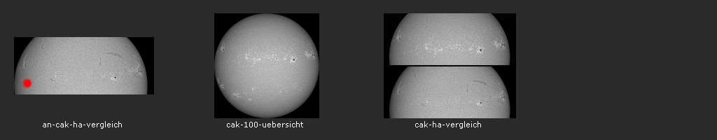 ALLE Vorschaubilder lassen sich durch Anklicken als großes Bild laden, welches jeweils in einem separaten Browserfenster geöffnet wird. Aufnahmekameras waren eine DMK31, DMK 41 und eine Celestron Skyris 445. Die .avifiles bestehen aus jeweils 2000 Rohbildern, von denen 10% gestackt wurden. Animierte Bewegungsabläufe (Zeitraffer) sind in den Vorschaubildern mit einem roten Punkt markiert. |
