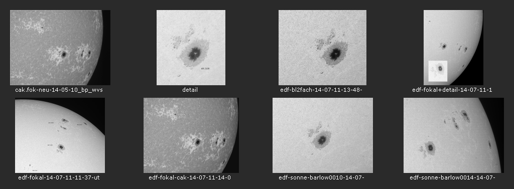 ALLE Vorschaubilder lassen sich durch Anklicken als großes Bild laden, welches jeweils in einem separaten Browserfenster geöffnet wird. Aufnahmekameras waren eine DMK31, DMK 41 und eine Celestron Skyris 445. Die .avifiles bestehen aus jeweils 2000 Rohbildern, von denen 10% gestackt wurden. Animierte Bewegungsabläufe (Zeitraffer) sind in den Vorschaubildern mit einem roten Punkt markiert. |