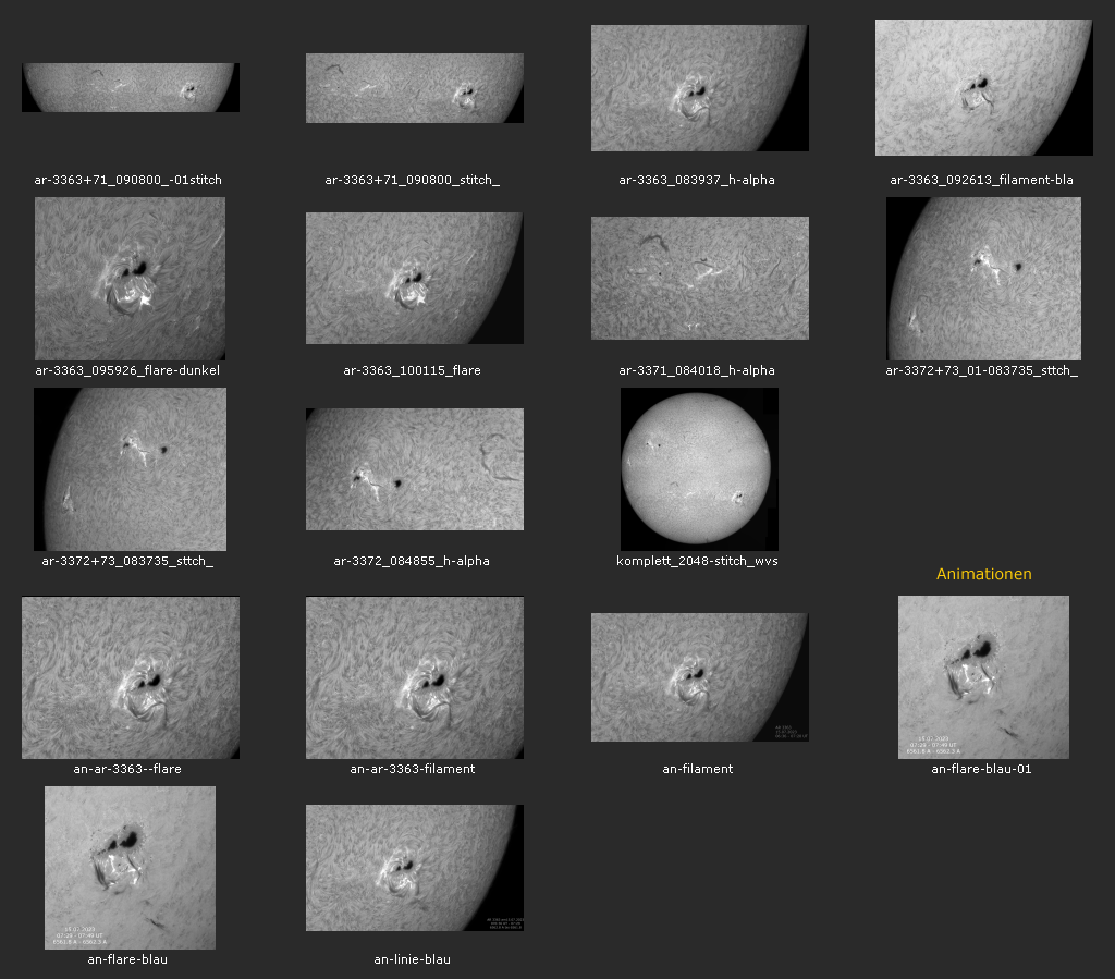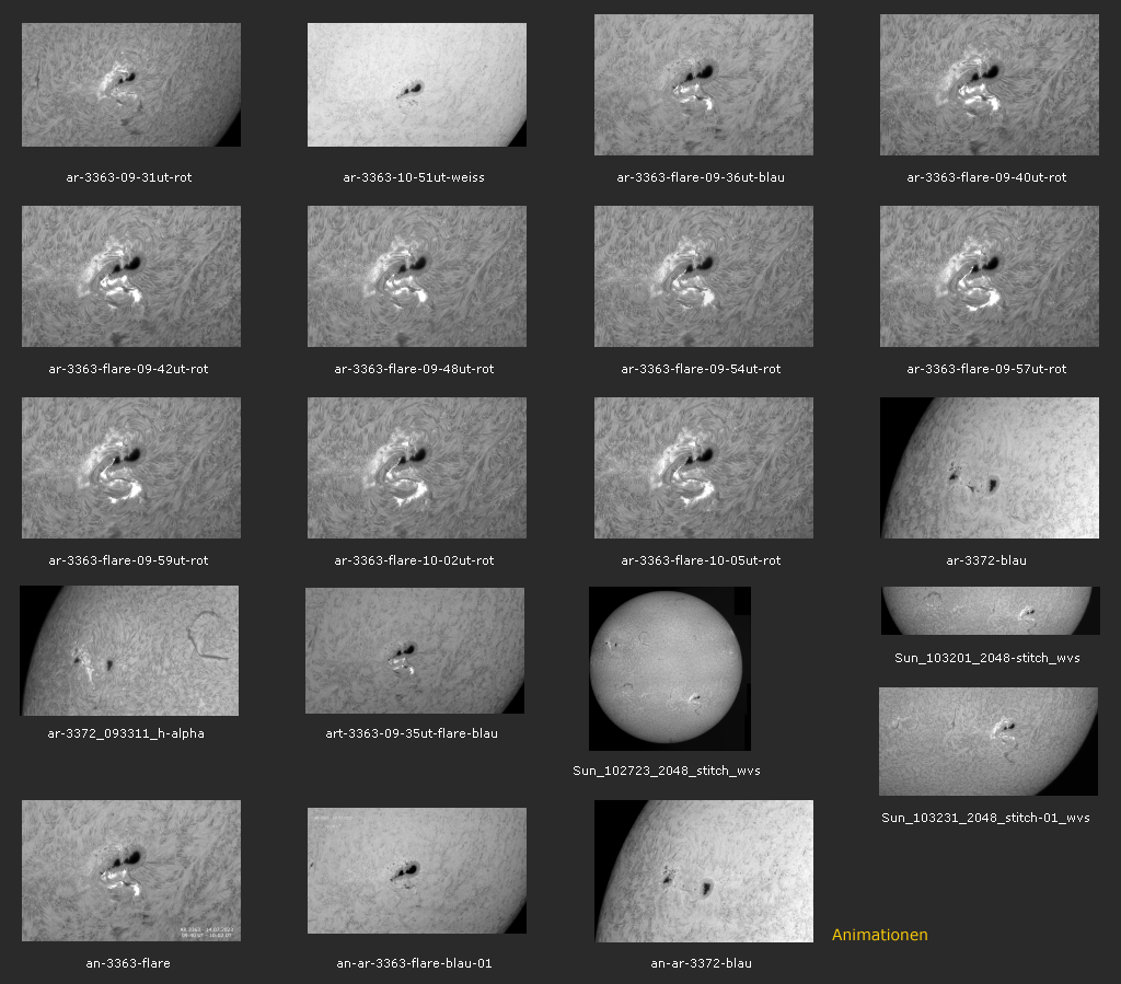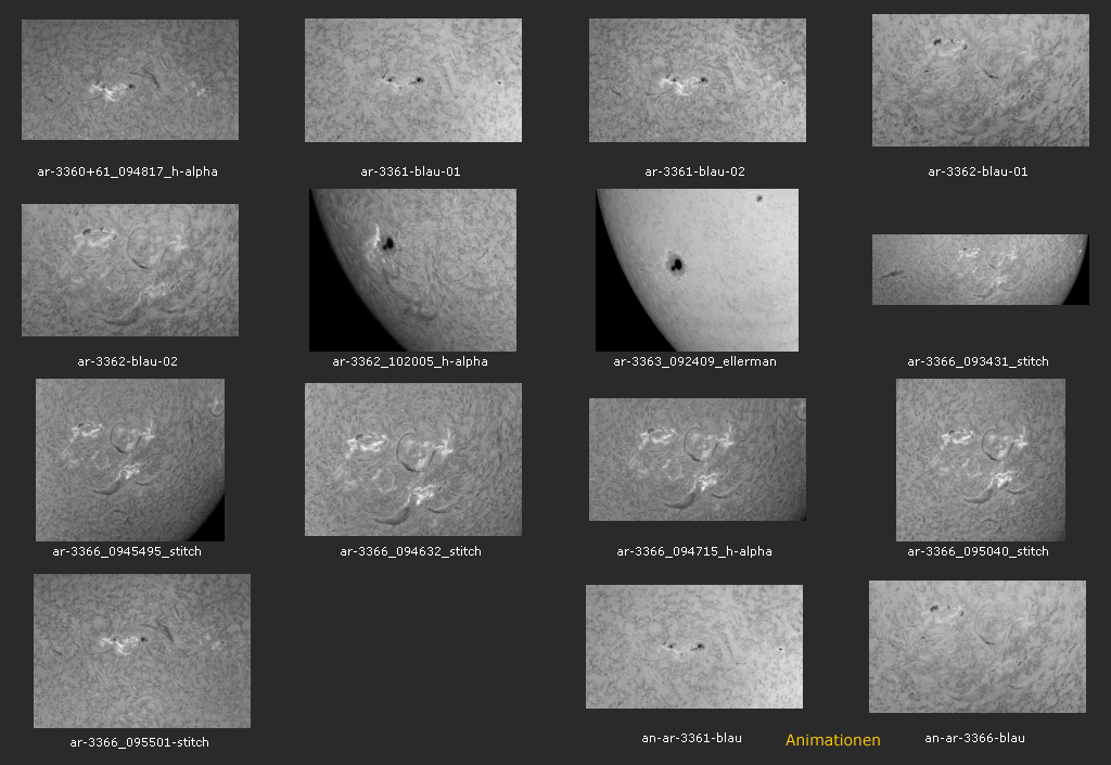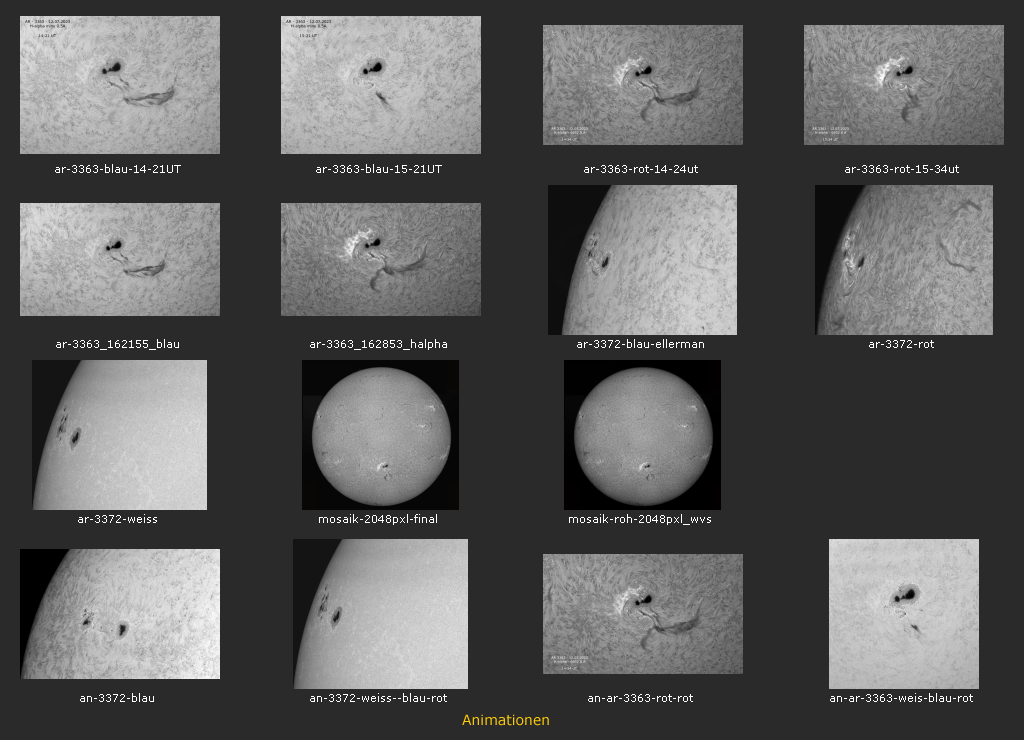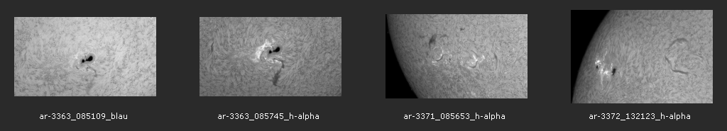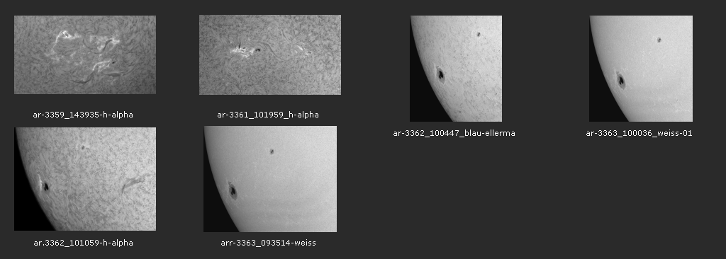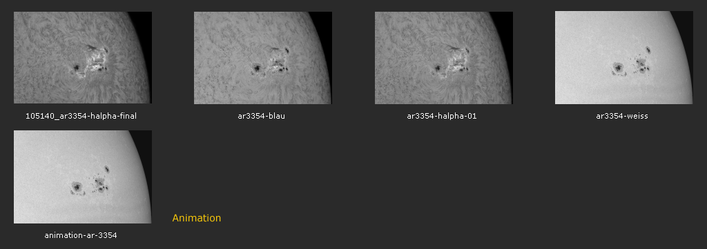 ALLE Vorschaubilder lassen sich durch Anklicken als großes Bild laden, welches jeweils in einem separaten Browserfenster geöffnet wird. Die Bilder in der CaK-II Linie wurden mit einem 80/600 mm Refraktor und einem Lunt CaK Modul mit einer Halbwertsbreite von < 2.4 À aufgenommen. Die Weißlichtbilder wurden mit 90 mm Öffnung und einer Brennweite von etwa 1500 mm Brennweite mit einem unbeheizten DayStar H-alpha Filter aufgenommen. Die H-alpha Bilder entstanden dann bei einer Halbwertsbreite von ca. 0.5 À in der zentralen H-alpha Linie aufgenommen. Die Bezeichnung "blau" in den Filenamen sind Bilder, aufgenommen im blauen Flügel der H-alpha Linie beim Aufheizen des Filters. Aufnahmekamera war in allen Fällen eine ZWO ASI 290 MM. Die .avifiles bestehen aus jeweils 2000 Rohbildern, von denen 10% gestackt wurden. |