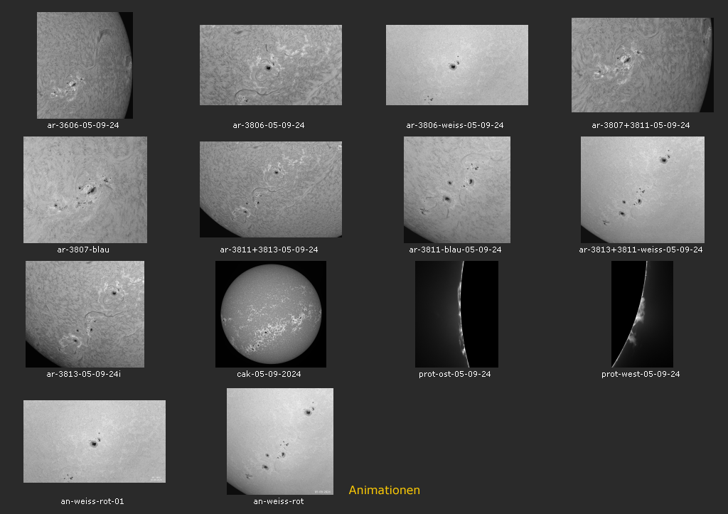 ALLE Vorschaubilder lassen sich durch Anklicken als großes Bild laden, welches jeweils in einem separaten Browserfenster geöffnet wird. Die Bilder in der CaK-II Linie wurden mit einem 80/600 mm Refraktor und einem Lunt CaK Modul mit einer Halbwertsbreite von < 2.4 À aufgenommen. Die Weißlichtbilder wurden mit 90 mm Öffnung und einer Brennweite von etwa 1500 mm Brennweite mit einem unbeheizten DayStar H-alpha Filter aufgenommen. Die H-alpha Bilder entstanden dann bei einer Halbwertsbreite von ca. 0.5 À in der zentralen H-alpha Linie aufgenommen. Die Bezeichnung "blau" in den Filenamen sind Bilder, aufgenommen im blauen Flügel der H-alpha Linie beim Aufheizen des Filters. Aufnahmekamera war in allen Fällen eine ZWO ASI 290 MM. Die .avifiles bestehen aus jeweils 2000 Rohbildern, von denen 10% gestackt wurden. |