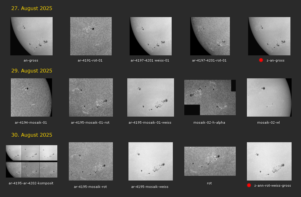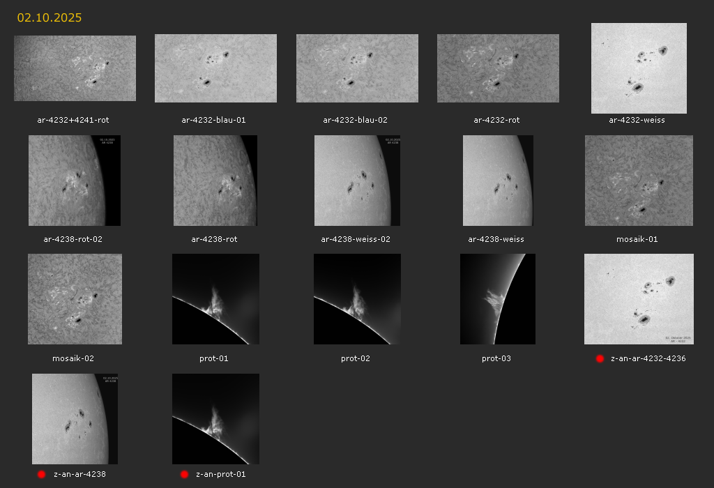 ALLE Vorschaubilder lassen sich durch Anklicken als großes Bild laden, welches jeweils in einem separaten Browserfenster geöffnet wird. Die Bilder in der CaK-II Linie wurden mit einem 80/600 mm Refraktor und einem Lunt CaK Modul mit einer Halbwertsbreite von < 2.4 À aufgenommen. Die Weißlichtbilder wurden mit 90 mm Öffnung und einer Brennweite von etwa 1500 mm Brennweite mit einem unbeheizten DayStar H-alpha Filter aufgenommen. Die H-alpha Bilder entstanden dann bei einer Halbwertsbreite von ca. 0.5 À in der zentralen H-alpha Linie aufgenommen. Die Bezeichnung "blau" in den Filenamen sind Bilder, aufgenommen im blauen Flügel der H-alpha Linie beim Aufheizen des Filters. Aufnahmekamera war in allen Fällen eine ZWO ASI 290 MM. Die .avifiles bestehen aus jeweils 2000 Rohbildern, von denen 10% gestackt wurden. Die Vorschaubilder, die mit einem roten Punkt markiert sind, sind Animationen. Alle Vorschaubilder lassen sich durch Anklicken vergrößern. |