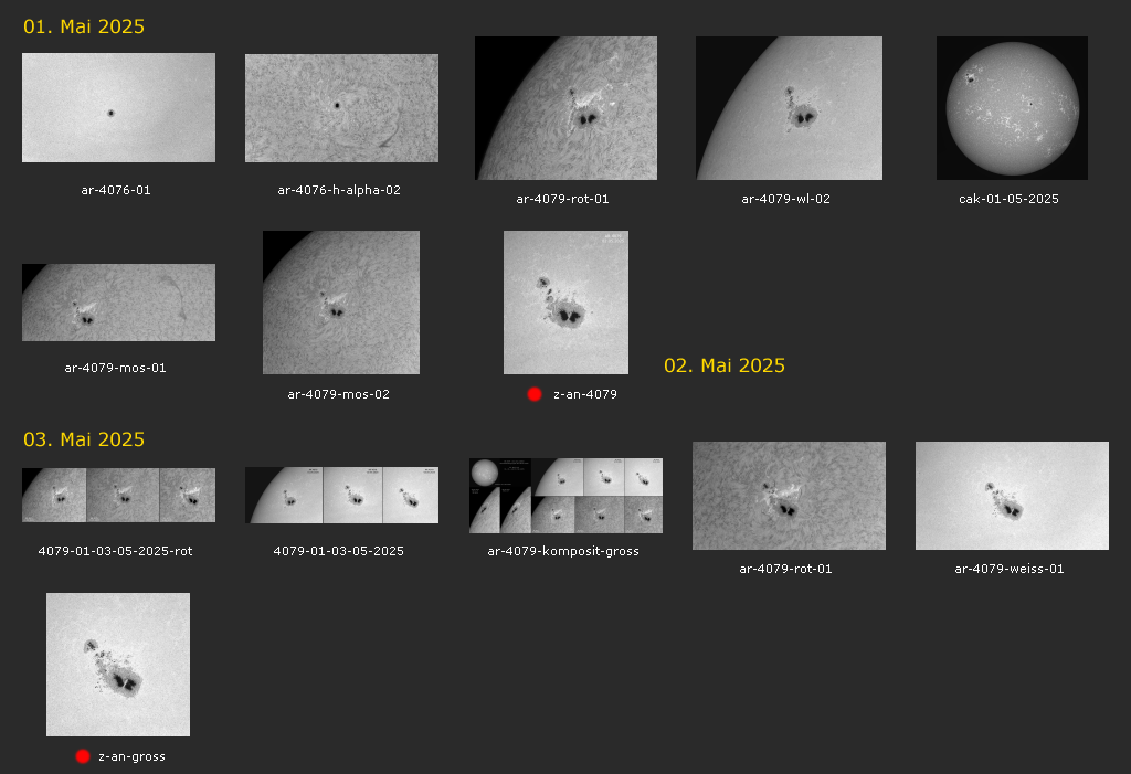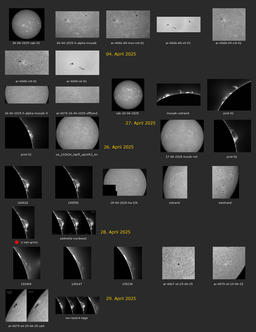 ALLE Vorschaubilder lassen sich durch Anklicken als großes Bild laden, welches jeweils in einem separaten Browserfenster geöffnet wird. Die Bilder in der CaK-II Linie wurden mit einem 80/600 mm Refraktor und einem Lunt CaK Modul mit einer Halbwertsbreite von < 2.4 À aufgenommen. Die Weißlichtbilder wurden mit 90 mm Öffnung und einer Brennweite von etwa 1500 mm Brennweite mit einem unbeheizten DayStar H-alpha Filter aufgenommen. Die H-alpha Bilder entstanden dann bei einer Halbwertsbreite von ca. 0.5 À in der zentralen H-alpha Linie aufgenommen. Die Bezeichnung "blau" in den Filenamen sind Bilder, aufgenommen im blauen Flügel der H-alpha Linie beim Aufheizen des Filters. Aufnahmekamera war in allen Fällen eine ZWO ASI 290 MM. Die .avifiles bestehen aus jeweils 2000 Rohbildern, von denen 10% gestackt wurden. Die Vorschaubilder, die mit einem roten Punkt markiert sind, sind Animationen. Alle Vorschaubilder lassen sich durch Anklicken vergrößern. |