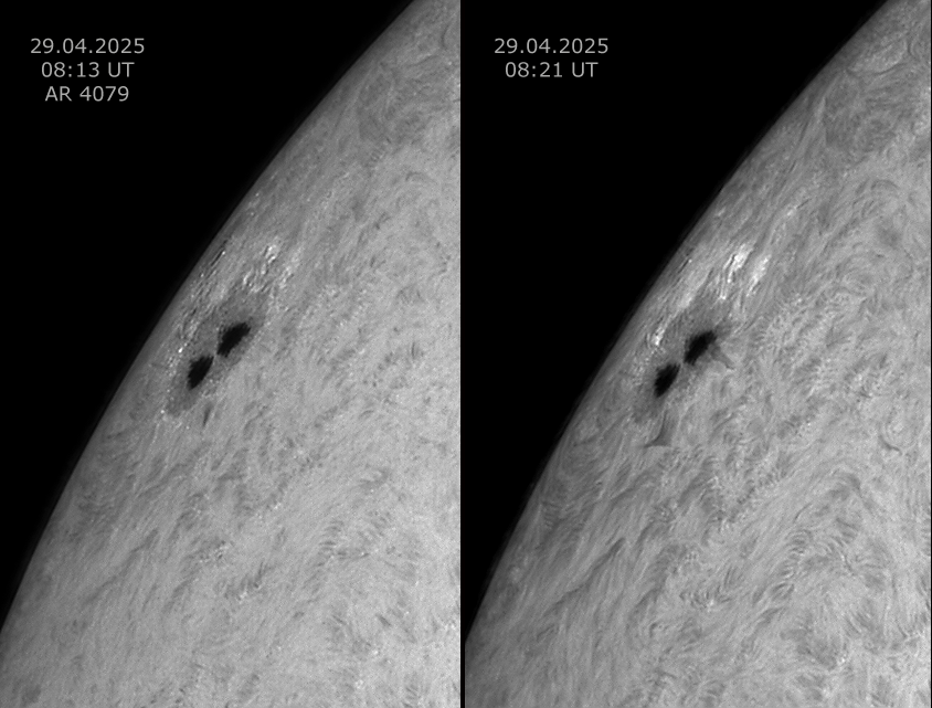 Die folgenden Webseiten zeigen Sonnenbilder des 25. Sonnenzyklus aus den Jahren 2023 und 2024. Die Bilder in der CaK-II Linie wurden mit einem 80/600 mm Refraktor und einem Lunt CaK Modul mit einer Halbwertsbreite von < 2.4 À aufgenommen. Die Weißlichtbilder wurden mit 90 mm Öffnung und einer Brennweite von etwa 1500 mm Brennweite mit einem unbeheizten DayStar H-alpha Filter aufgenommen. Die H-alpha Bilder entstanden dann bei einer Halbwertsbreite von ca. 0.5 À in der zentralen H-alpha Linie aufgenommen. Die Bezeichnung "blau" in den Filenamen sind Bilder, aufgenommen im blauen Flügel der H-alpha Linie beim Aufheizen des Filters. Aufnahmekamera war in allen Fällen eine ZWO ASI 290 MM. Die .avifiles bestehen aus jeweils 2000 Rohbildern, von denen 10% gestackt wurden. Die Vorschaubilder, die mit einem roten Punkt markiert sind, sind Animationen. |