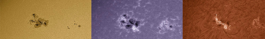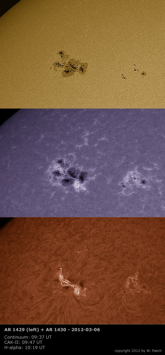 1430 am 3. Juni 2012 in drei Spektralbereichen (Kontinuum: 09:37 UT, CaK-II: 09:47 UT und H-alpha: 10:19 UT). Klicken Sie hier zum Laden einer großen Darstellung. |